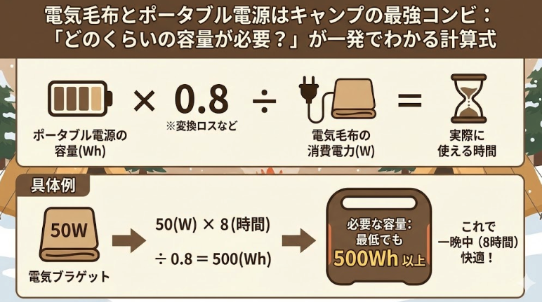 ポータブル電源の容量(Wh) × 0.8 ÷ 電気毛布の消費電力(W) = 実際に使える時間