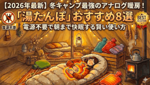 ▼ 湯たんぽ・電気毛布…「熱源」があれば朝まで爆睡ですあわせて読みたい 【2026年最新】冬キャンプ最強のアナログ暖房!「湯たんぽ」おすすめ8選。電源不要で朝まで快眠する賢い… 電源いらずで暖かい!冬キャンプは「湯たんぽ」で賢く寒さ対策。初心者も安心の選び方、失敗しない安全な使い方、おすすめ8選を徹底ガイドします。手軽に始める最強のアナログ暖房。あわせて読みたい 【2026年最新】キャンプ用電気毛布おすすめ10選|就寝時の最強の寒さ対策!選び方からポータブル電源と… 冬キャンプの夜、寒さで眠れない…その悩み「電気毛布」が解決します!火を使わないから安全で、ポータブル電源でも朝までぬくぬく。初心者におすすめの選び方から人気10選まで、快眠の秘訣を徹底ガイド。