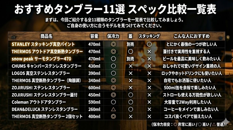 まずは、今回ご紹介する全11種類のタンブラーを一覧表で比較してみましょう。ご自身の使い方に合うモデルを見つけてみてください。