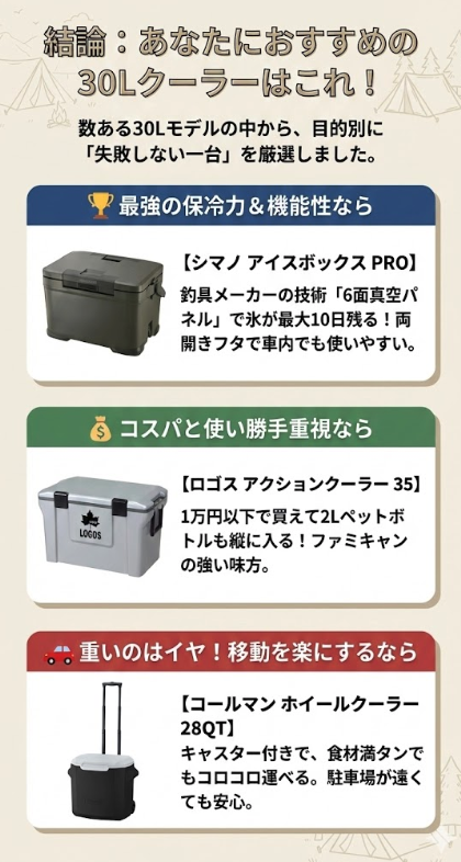 ここからは、キャンプ歴8年の筆者が厳選した「30Lクラスの最強ハードクーラー」をご紹介します。 あなたのスタイルに合わせて選べるよう、4つのカテゴリに分類しました。各商品の「2Lペットボトル縦置き判定」も要チェックです!