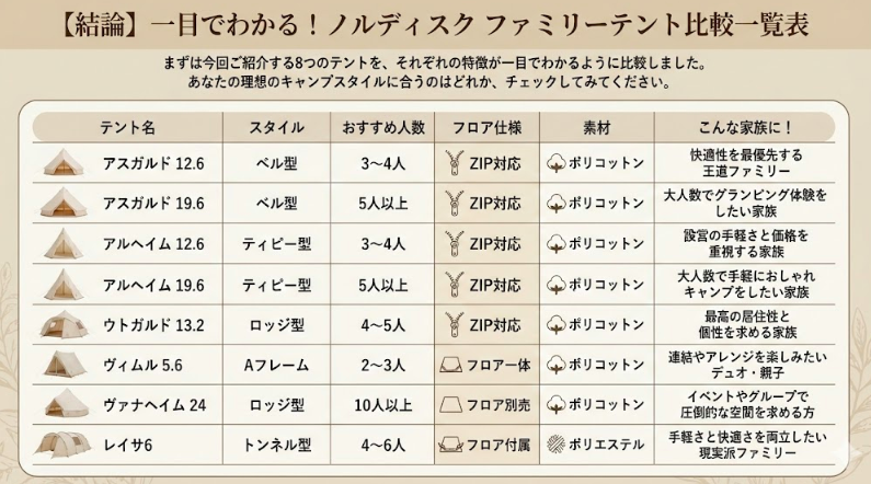 【結論】一目でわかる!ノルディスク ファミリーテント比較一覧表