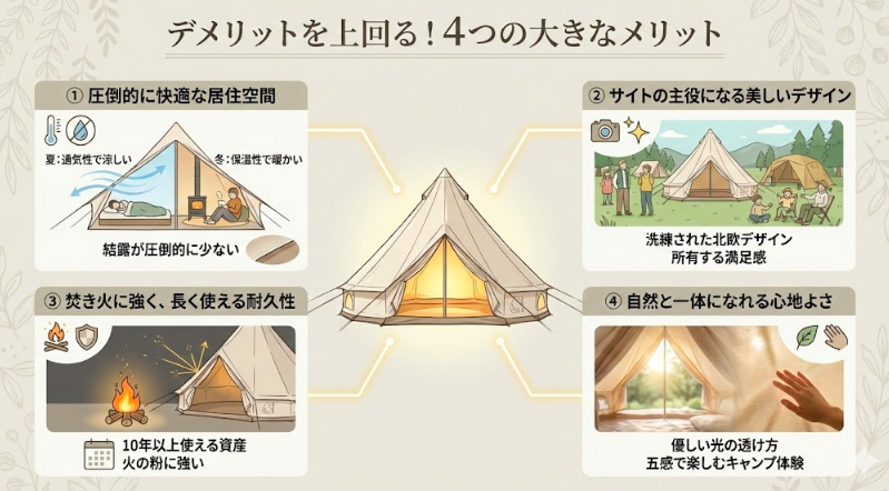 でも、その美しい見た目の裏で「コットンテントって手入れが大変?」「雨の日は本当に大丈夫?」「価格が高い分、買ってから後悔したくない…」そんな不安をお持ちではありませんか?