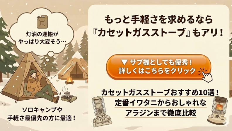 あわせて読みたい 【2025年】カセットガスストーブおすすめ10選!定番イワタニからおしゃれなアラジンまで徹底比較 冬キャンプにおすすめのカセットガスストーブ10選を徹底比較!定番イワタニからソロ向け小型モデル、おしゃれなアラジンまで。テント内での安全な使い方もキャンパー目線で詳しく解説。あなたにぴったりの一台が見つかります。