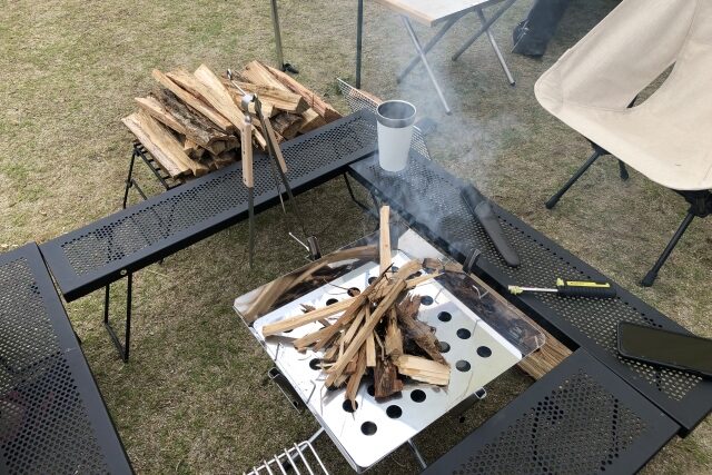 焚き火台やグリルをテーブルで四角く囲むスタイルです。 「テーブルがガード代わりになって安全」と言われますが、過信は禁物です。